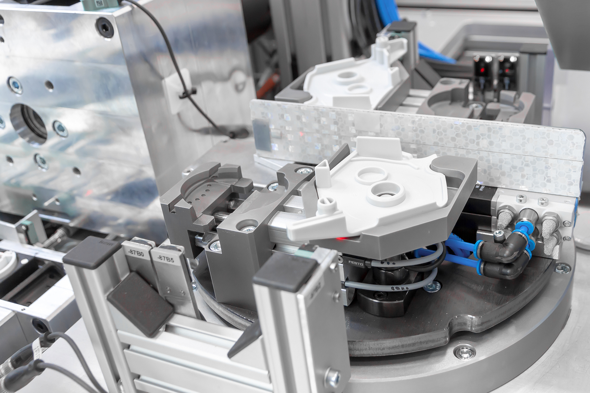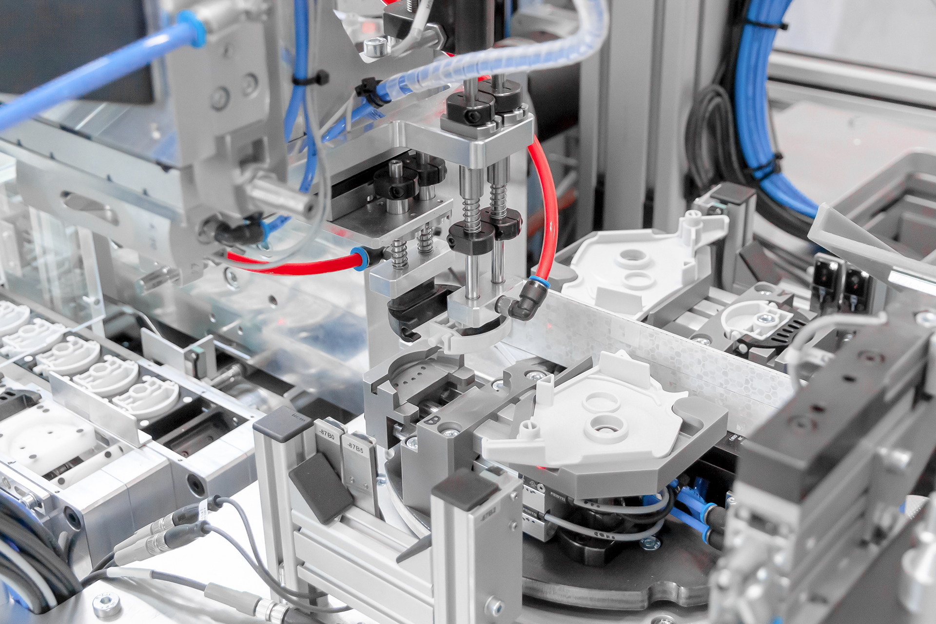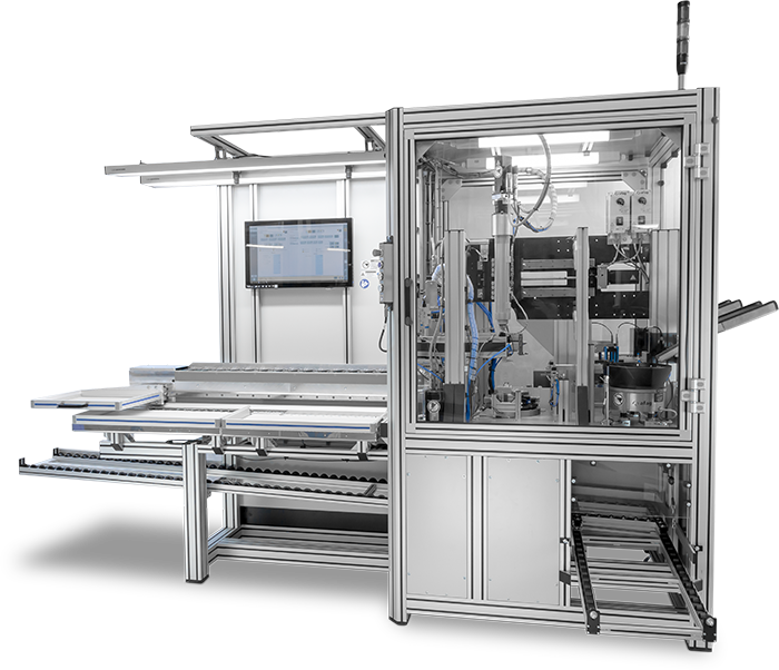 Automatisierte Einpress-Fügeanlage zur effizienten Montage mechanischer Baugruppen mit parallelen Prozessen, integrierter Gamification und adaptiver Bedienerführung zur Leistungsoptimierung.