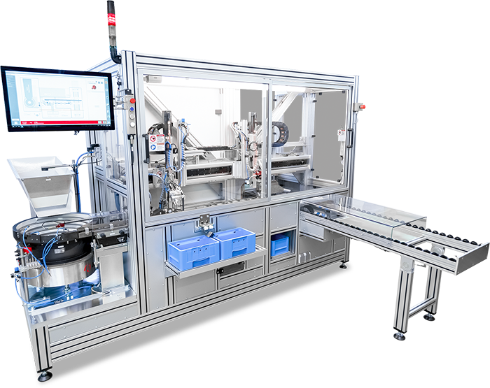Vollautomatische Prüf- und Verpackungslösung zur hochpräzisen Qualitätskontrolle von Präzisionsfrästeilen mit 3D-Vermessung, Inspektion, Klassierung und direkter Verpackung für stabile Serienprozesse.