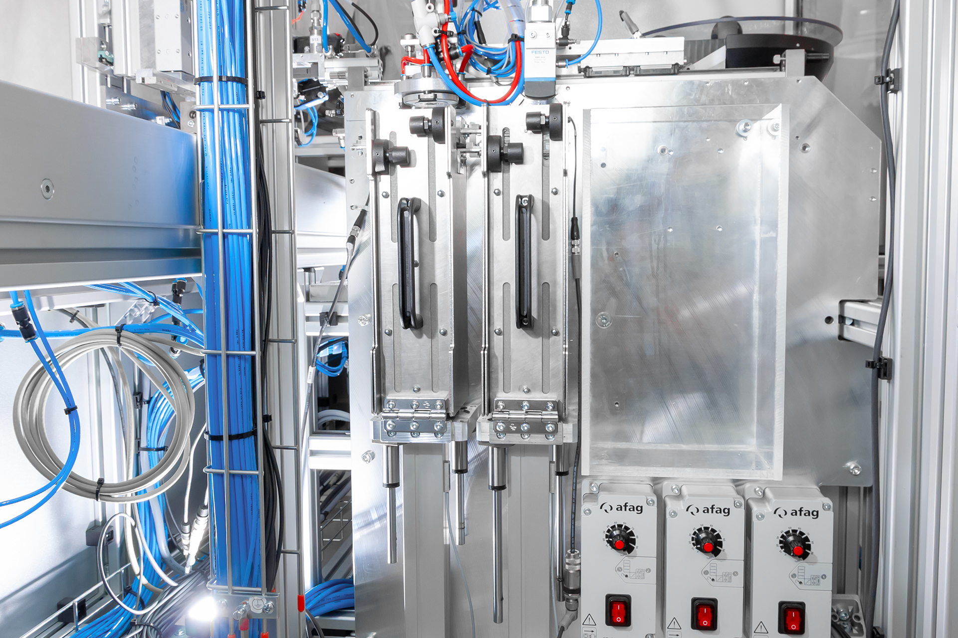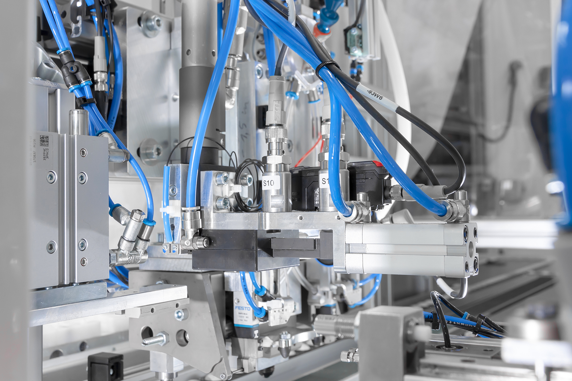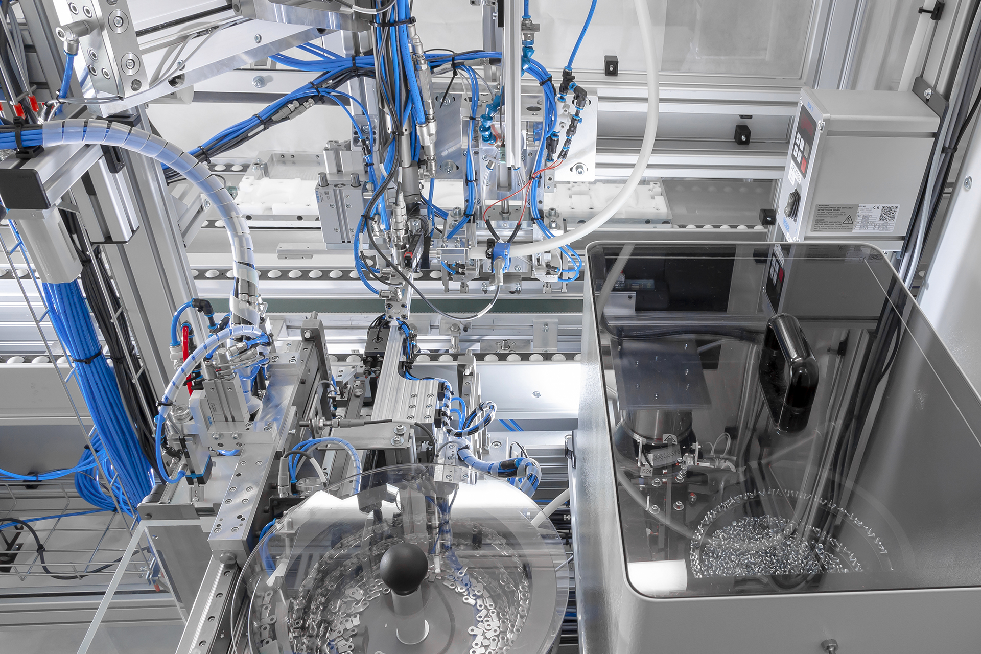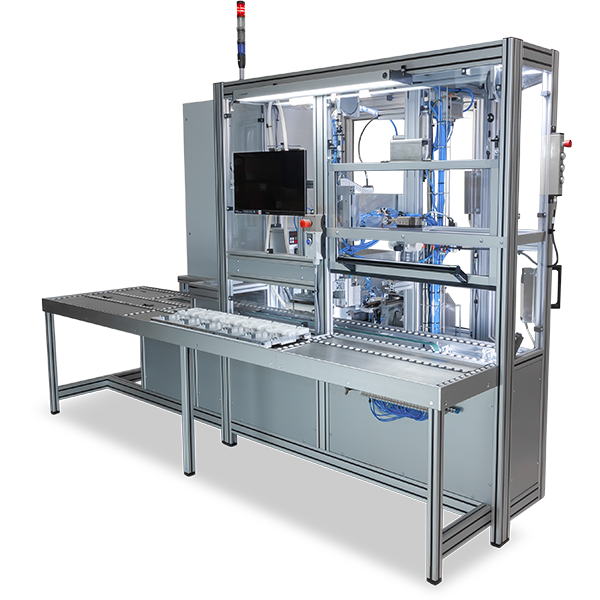 Teilautomatisierter Schraub- und Montagearbeitsplatz zur prozesssicheren Montage von Melderbaugruppen mit automatischer Verschraubung, präziser Kleinteilzuführung und integrierter Werkerprüfung.